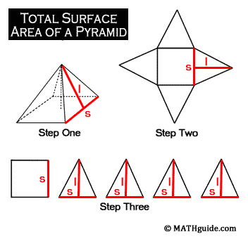 We can use the area formulas for a rectangle and a triangle to determine the complete formula for the surface area of the pyramid. The square (or base of the solid) has an area that can be calculated by multiplying its length times its width. Since those dimensions are equal, the area is s x s = s2. Now we need to calculate the area of the remaining surfaces. The remaining surfaces happen to form the lateral surface area of the pyramid, which are triangles. The area formula for a triangle is its base times its height divided by two. In the case of one of the triangles above it would be s x l ÷ 2. However, there are four triangles. This would make the total lateral surface area equal to four times the area of one triangle, or 4 x s x l ÷ 2. Upon simplifying the expression, we get 2sl. The total surface area of the pyramid is equal to the area of the base plus its lateral surface area or s2 + 2sl. So, given the base length of the pyramid, s, and its slant height, l, the total surface area is not a difficult computation. Yet, when dimensions are provided for a pyramid, one is rarely provided with the slant height, l. Instead, the height of the pyramid is given. This is an important difference, as one is always larger than the other.