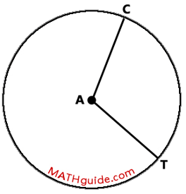 The diagram above shows Circle A. [A circle is always named by its center.] The central angle is angle CAT. Notice that point-A is the vertex of the angle, which is at the center of the circle. Also notice arc CT, which is the rim of the circle that connects point-C to point-T. Two segments of interest within the diagram would be two radii, segment AC and segment AT.