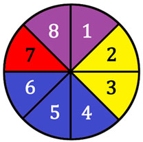 The player pays $2 and spins the spinner. If the spinner lands on purple, the player wins $0.50. If the spinner lands on yellow, the player wins $5. If the spinner lands on blue, the player wins $1. If the spinner lands on red, the player wins nothing. To determine who this game favors, we must fill an expected values table. This requires us to know a little bit about probability, too. If all the spaces on the spinner are the same size, which is a safe assumption based upon the spinner presented here, there is a 1 in 8 chance of landing on any one space. We will use that fact to fill the table. To land on purple, there are two spaces. So, the probability of landing on purple is 2/8. Let’s fill in the table with the information for purple. Keep in mind, the expected value (amount the player wins) for purple is $0.50.