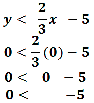 Next, we have to determine how the greater than affects the graph. The inequality means we want all the points where the y-value is less than "five less than 2/3 the x-value." To determine this, we simply test a point off of the line. Let us choose (0,0) because it is an easy point to work with.